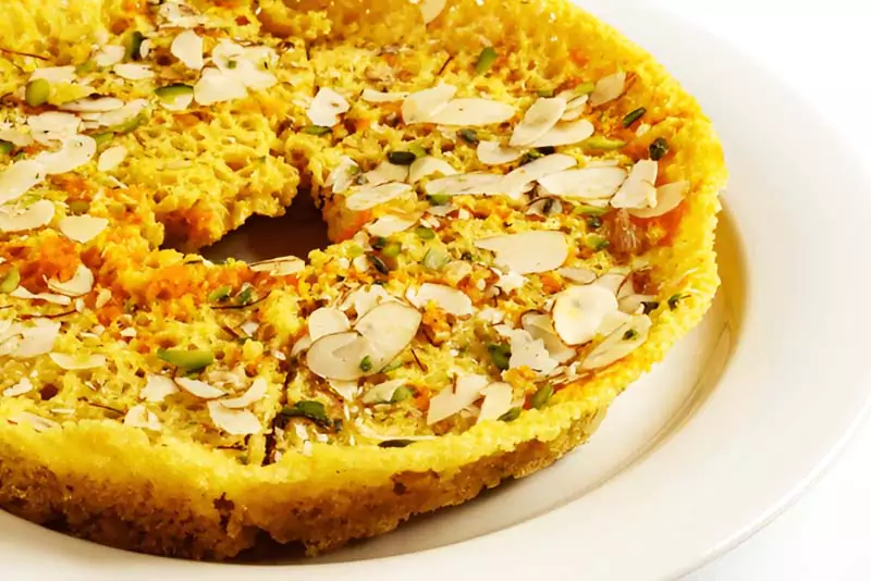 Ghewar is a traditional Rajasthani dessert that’s especially popular during festivals like Teej and Raksha Bandhan. This round, honeycomb-textured sweet is made from flour, deep-fried, and soaked in sugar syrup. It’s often topped with rabri (thickened sweet milk) or cream, making it even more indulgent. The unique crispy texture and rich flavor make Ghewar a must-try while you’re in Jaipur. For the best taste, visit LMB (Laxmi Misthan Bhandar) or Rawat Mishthan Bhandar, two of the city’s most famous sweet shops.